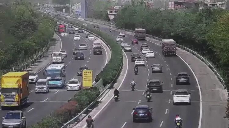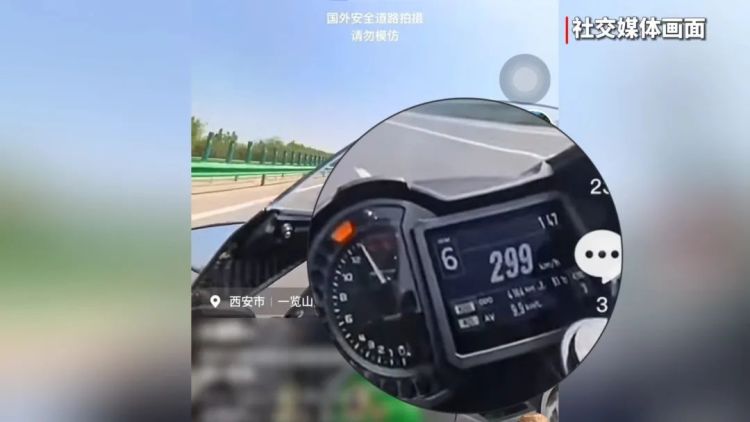 2025年4月22日,一段4分26秒的视频在短视频平台传播。画面中,多辆摩托车在高速公路上交替追逐,持续加速,其中一辆摩托车的仪表盘指针始终维持在299km/h的最高刻度线上,发布者配文:“国外安全道路拍摄请勿模仿。”画面中道路指示牌陆续出现“华胥”、“蓝田”、“商洛”等字样。